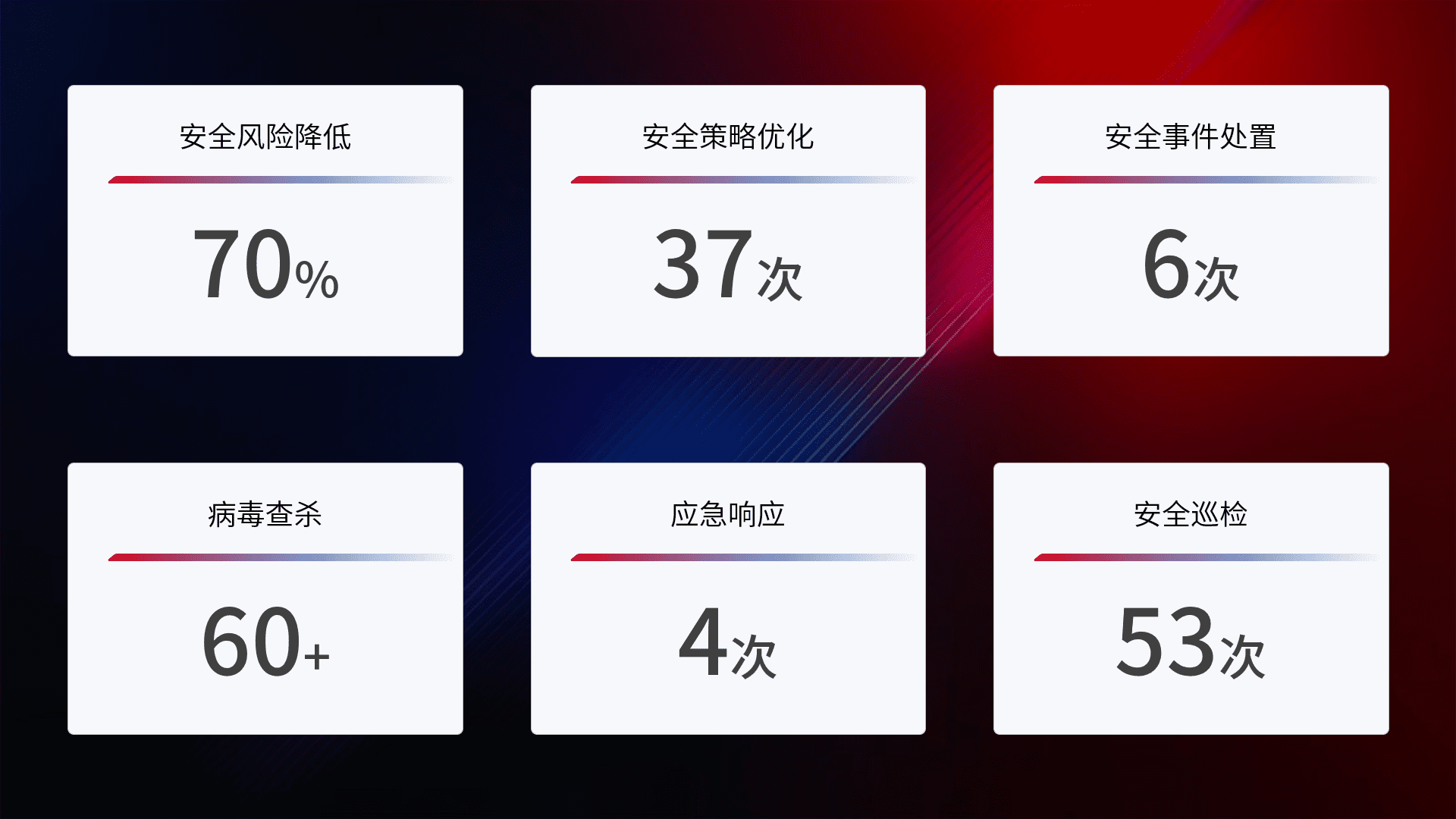 提供全面的安全事件报告体系,,,包括处置报告、、、周报、、、、季度和年度总结,,结合持续监控,,,帮助客户深入了解网络安全状况。。