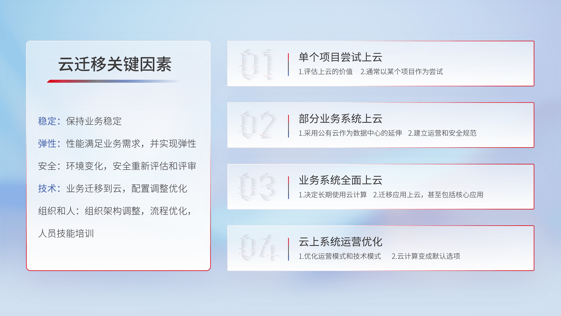 结合实际业务,,,,从规划设计、、云平台选型、、、云原生改造、、、数据迁移、、、集成交付,,迁移全过程为客户识别最佳上云路径,,做好风险识别管理,,,设计网络架构、、、身份权限、、、、安全审计合规、、、操作审计、、、日志审计、、、监控告警策略、、、多站点容灾设计等,,,对云上基础设施进行整体规划,,,,提升IT治理水平,,以满足弹性、、、、高可用、、高性能的需求。。。